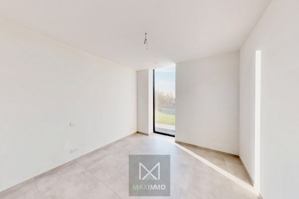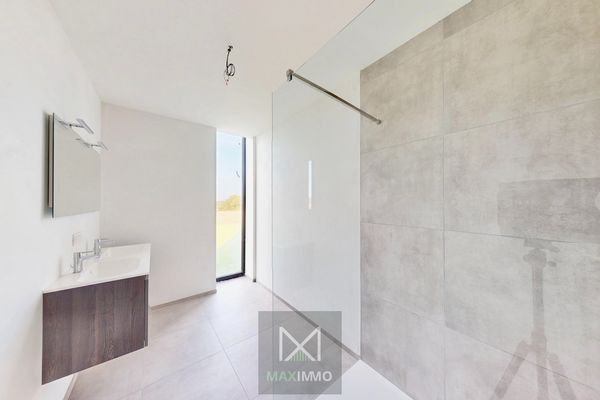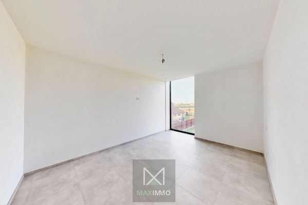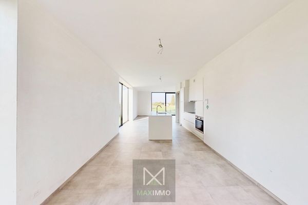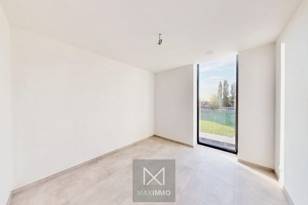 🏡 Maison neuve semi-ouverte à vendre à Rekkem avec jardin, garage, panneaux solaires et magnifique vue sur les champs à l’arrière — visible depuis le séjour, la cuisine, la salle de bain et la chambre principale.