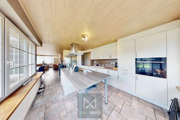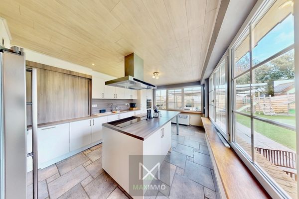 Le séjour lumineux avec poêle à pellets et vue sur le jardin crée une atmosphère chaleureuse. La cuisine moderne (rénovée en 2014) est équipée d’appareils récents, dont une plaque à induction et un four (2025).