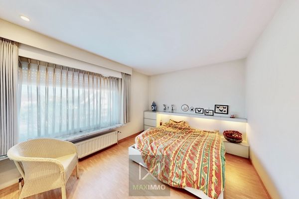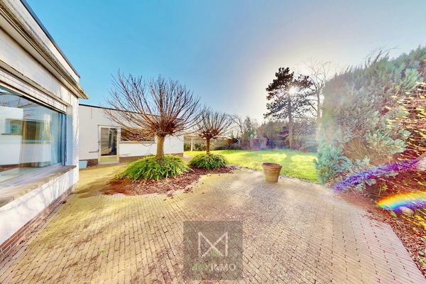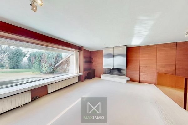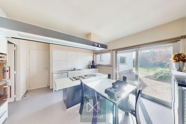 Dès l’entrée, un hall spacieux vous mène vers le séjour lumineux avec feu ouvert et placards intégrés. Les grandes baies vitrées apportent une belle luminosité naturelle et offrent une agréable vue sur le jardin.