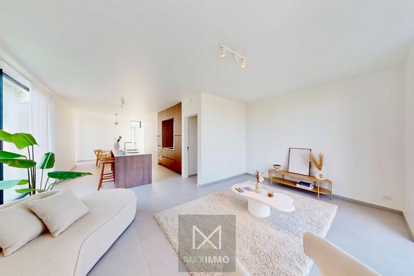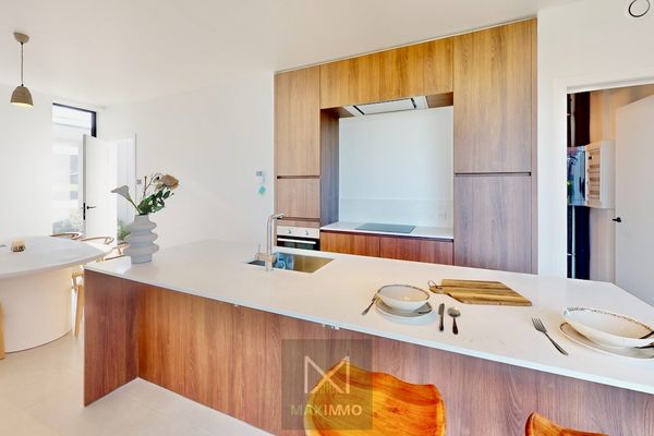 De open keuken is ideaal gepositioneerd met zicht op zowel de eettafel, het terras als de zithoek, waardoor het leefgedeelte één harmonieus geheel vormt.