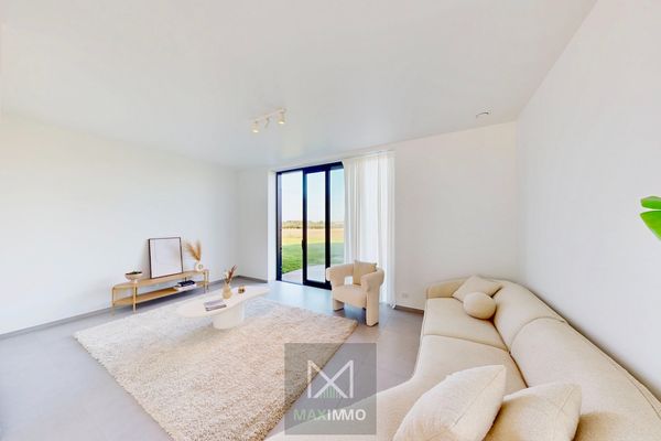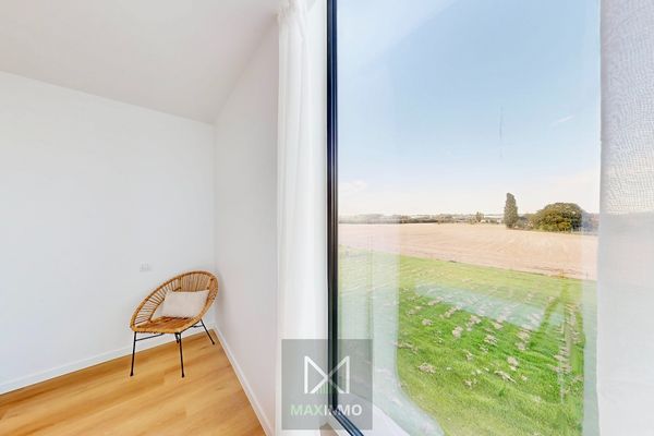 Moderne halfopen nieuwbouwwoning te koop in Rekkem met tuin, garage, zonnepanelen en prachtig zicht op de achterliggende velden — vanuit de leefruimte, keuken, badkamer en slaapkamer.